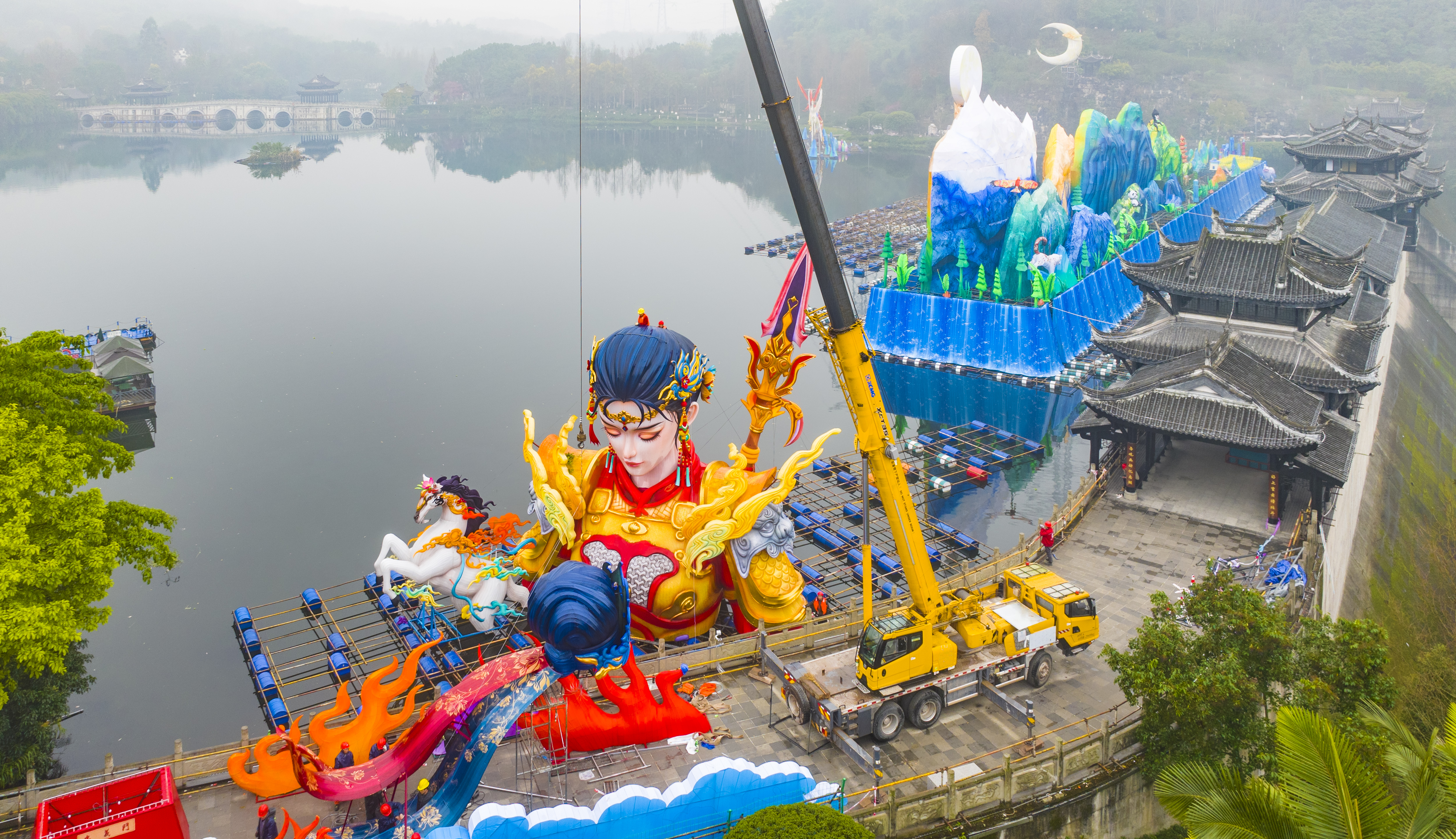 ▲2026重慶市新春燈會——“禧歡霓”園博園大型水上燈會,工人們正在抓緊搭建《巾幗良玉》燈組。記者 齊嵐森 攝/視覺重慶