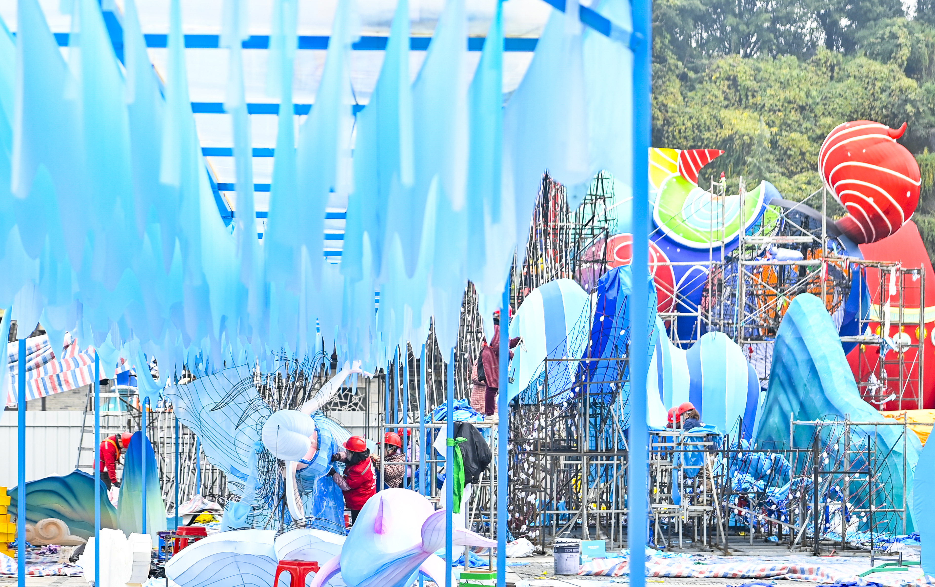 ▲2026重慶市新春燈會——“禧歡霓”園博園大型水上燈會現(xiàn)場,工人正加緊搭建各種造型的彩燈。記者 齊嵐森 攝/視覺重慶