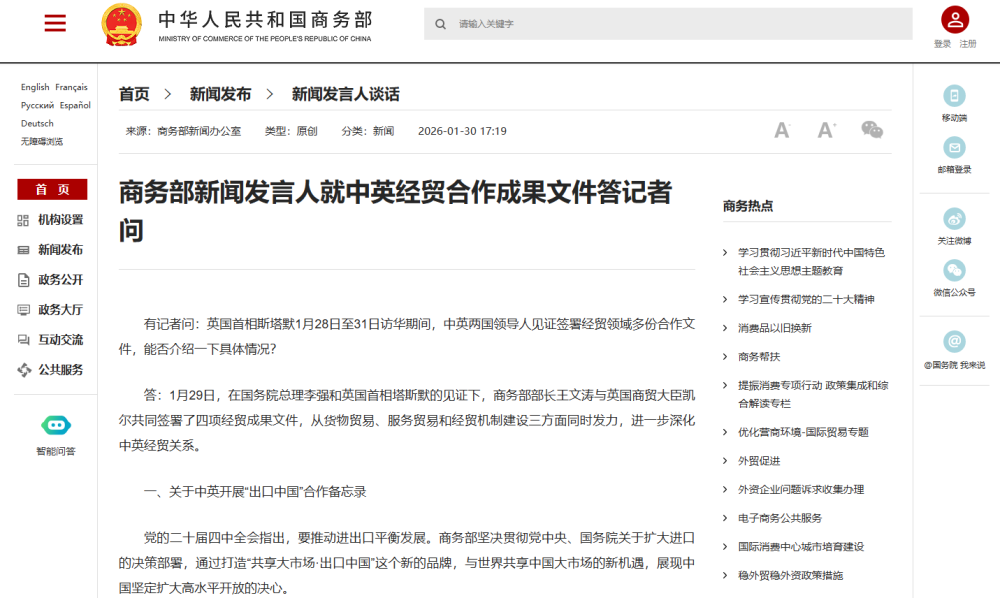 商務(wù)部新聞發(fā)言人就中英經(jīng)貿(mào)合作成果文件答記者問