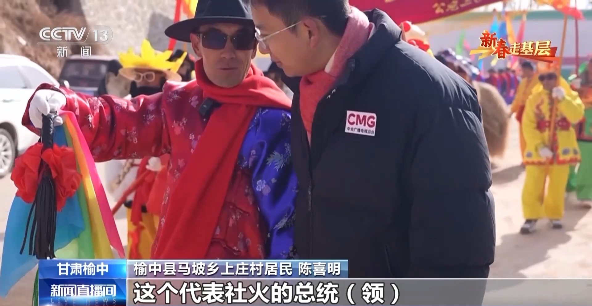 榆中縣馬坡鄉(xiāng)上莊村居民 陳喜明:這個代表社火的總統(tǒng)領(lǐng),是給我們引場子的,社火就是把大家召集到一起,前段時間這里遭災(zāi),搞個社火把大家的精神提一提。