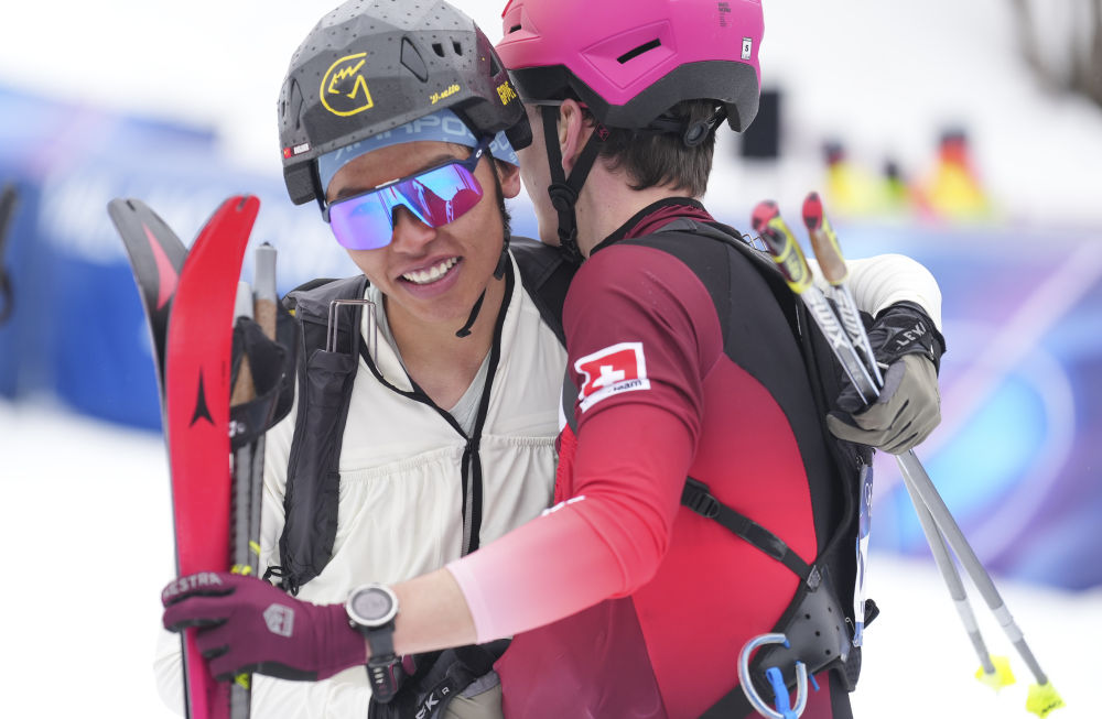 米蘭-科爾蒂納冬奧會滑雪登山混合接力比賽后,布魯爾(左)與瑞士選手相擁致意(2026年2月21日攝)。新華社記者 胡虎虎 攝