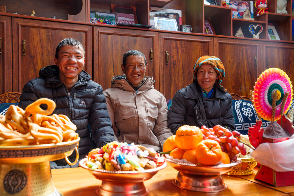 次旦玉珍的父親旦增群培(中)、母親德吉卓瑪(右)和弟弟達瓦頓珠坐在家中,背后的書架上擺放著許多次旦玉珍的參賽照片和參賽紀(jì)念品(2026年2月7日攝)。新華社記者 丁增尼達 攝