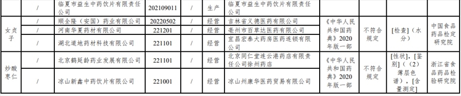 經(jīng)浙江省食品藥品檢驗研究院檢驗,標(biāo)示為北京鶴延齡藥業(yè)發(fā)展有限公司、涼山新鑫中藥飲片有限公司生產(chǎn)的2批次炒酸棗仁不符合規(guī)定,不符合規(guī)定項目包括性狀、鑒別、含量測定。