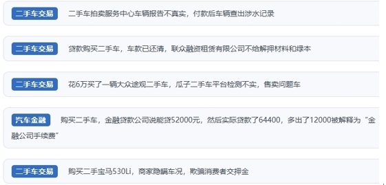 車輛報(bào)告弄虛作假,如私自篡改修車記錄、涉水記錄、里程記錄、保險(xiǎn)信息、違章信息等,消費(fèi)者付款后車輛到手使用時(shí)方才知曉;商家魚(yú)目混珠、以次充好,刻意隱瞞車輛來(lái)源,運(yùn)營(yíng)車充當(dāng)非運(yùn)營(yíng)車輛賣,涉案車輛充當(dāng)正常車輛賣;訂金、押金、保證金隨意收,取消交易后商家拒不退還;交易合同陷阱多,發(fā)票真假難辨,車輛售后維修服務(wù)難保障;實(shí)際貸款數(shù)額與申請(qǐng)額度不符、手續(xù)費(fèi)多少不明了、提前還款收取高額違約金,金融貸款“陷阱”防不勝防……
