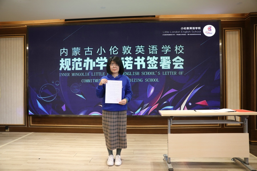 “堅持黨的領(lǐng)導(dǎo),堅持社會主義辦學(xué)方向,持證辦學(xué),依法辦學(xué)。以興趣培養(yǎng)為目標(biāo),推動國際化人才的培養(yǎng)。堅決推進“減負(fù)”,不擅自提升學(xué)費,不在法定節(jié)假日安排授課。招生宣傳真實可信,杜絕夸大宣傳、虛假承諾、捆綁誘導(dǎo)、隱瞞欺詐等方式誤導(dǎo)學(xué)生及家長的行為……”簽署會現(xiàn)場,內(nèi)蒙古小倫敦英語學(xué)校副校長尚燕云宣讀《內(nèi)蒙古小倫敦英語學(xué)校規(guī)范辦學(xué)承諾書》。
