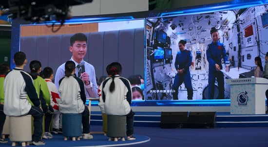 12月9日,中國(guó)空間站“天宮課堂”第一課正式開講,此次授課活動(dòng)在中國(guó)科技館設(shè)地面主課堂,在廣西南寧、四川汶川、香港、澳門分設(shè)4個(gè)地面分課堂,共1420名中小學(xué)生代表參加現(xiàn)場(chǎng)活動(dòng)。圖為青少年向航天員提問(wèn)。中國(guó)科技館供圖