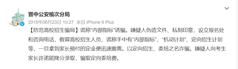 每年各省市投檔分?jǐn)?shù)線公布后,總是“幾家歡喜幾家愁”,不法分子也在此刻瞄準(zhǔn)了落榜考生。根據(jù)各地公安部門通報(bào),一些不法分子假冒高校招生人員或聲稱“熟悉”高校招生辦,點(diǎn)對(duì)點(diǎn)與相關(guān)考生取得聯(lián)系。隨后謊稱有某高校的“內(nèi)部指標(biāo)”“機(jī)動(dòng)計(jì)劃”,或是以“定向招生”“委培招生”等名義“降分錄取”考生,誘騙其繳納相關(guān)費(fèi)用。需要注意的是,在實(shí)施這些詐騙行為時(shí),不法分子往往使用電腦合成技術(shù)偽造“招生文件”“學(xué)校公章”等,騙取考生及家長的信任。