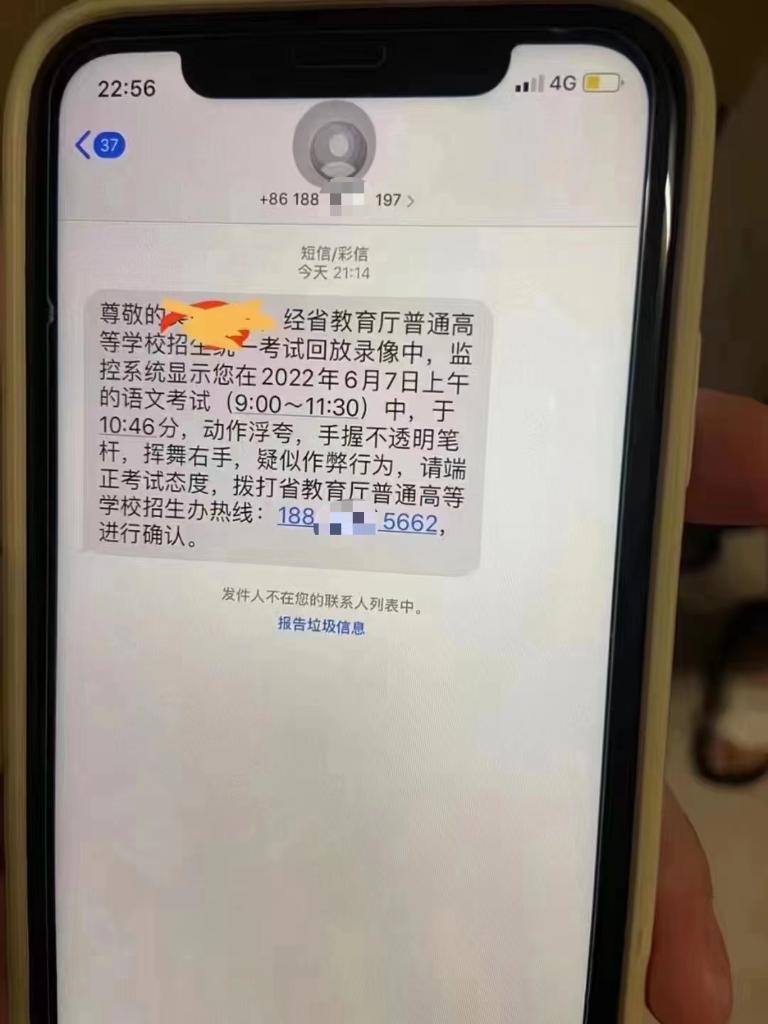 “尊敬的考生×××,經(jīng)省教育廳普通高等學(xué)校招生統(tǒng)一考試回放錄像中,監(jiān)控系統(tǒng)顯示您在2022年6月7日上午的語文考試(9:00—11:30)中,于10時(shí)46分,動(dòng)作浮夸,手握不透明筆桿,揮舞右手,疑似作弊行為,請(qǐng)端正考試態(tài)度,撥打省教育廳普通高等學(xué)校招生辦熱線:188×××進(jìn)行確認(rèn)?!苯?,有考生向廈門警方反映,自己接到了聲稱是“省教育廳普通高等學(xué)校招生辦”的通知短信,懷疑是詐騙信息。該短信在開頭準(zhǔn)確寫明了考生姓名,并在結(jié)尾要求考生主動(dòng)撥電話號(hào)碼進(jìn)行確認(rèn)。經(jīng)與教育部門核實(shí)確認(rèn),高考作弊違規(guī)行為不會(huì)以短信、電話、鏈接等方式通知。廈門警方提醒,不法分子通過非正常渠道搜集到考生信息,并向考生發(fā)送所謂“疑似作弊”的通知短信,考生一旦回?fù)茈娫?,就可能被不法分子以“處理作弊行為”為由?shí)施詐騙?! ?/p>