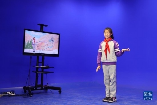 3月23日,一名學(xué)生在內(nèi)蒙古自治區(qū)氣象局天氣預(yù)報(bào)演播室內(nèi)體驗(yàn)演播過程。