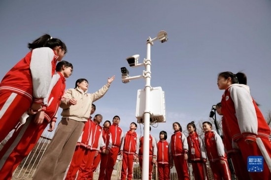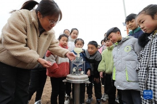 3月23日,在河北省遵化市氣象臺,工作人員為小學(xué)生介紹氣象觀測知識。