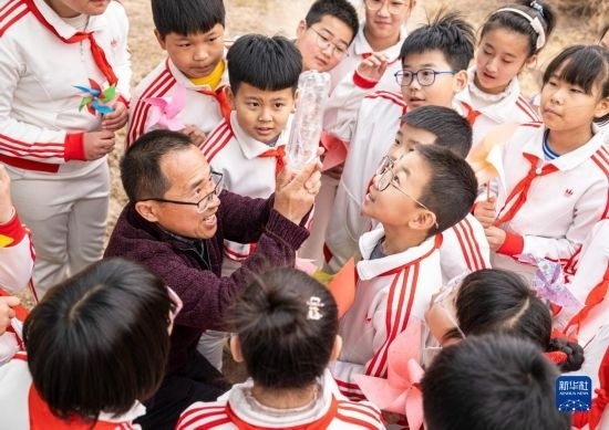 3月23日,河南省焦作市溫縣氣象局工作人員為小學(xué)生介紹雨量傳感器工作原理。