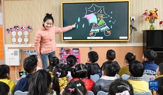 3月23日,河南省濟(jì)源市愚公路幼兒園的老師在課堂上為小朋友們講解雨水的形成過程。