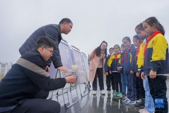 3月23日,貴州省黔東南苗族侗族自治州岑鞏縣氣象局工作人員為學(xué)生講解氣象知識。