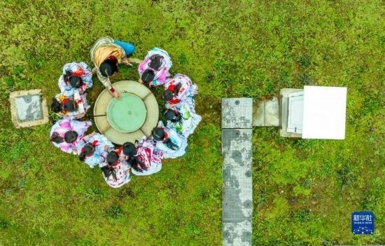 3月23日,學(xué)生在貴州省黔西市氣象局綜合氣象觀測站觀看大型蒸發(fā)皿(無人機(jī)照片)。