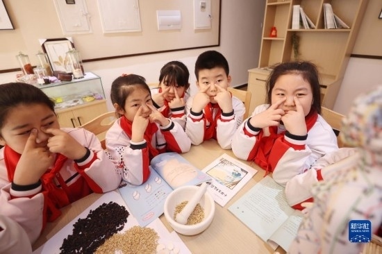 3月24日,河北省廊坊市第五小學(xué)學(xué)生在該校國醫(yī)館內(nèi)跟隨老師識(shí)別中藥。