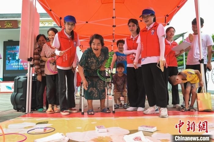 圖為學(xué)子們與村民共同體驗(yàn)套圈讀順口溜游戲。 陳一鳴 攝
