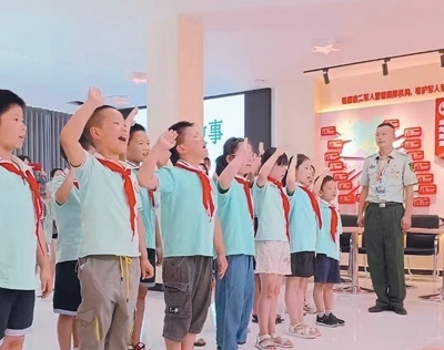 四川鹽亭縣文同小學(xué)學(xué)生在縣退役軍人之家活動(dòng)中心學(xué)習(xí)英模事跡,獻(xiàn)唱少先隊(duì)隊(duì)歌。李 勤攝(人民視覺)