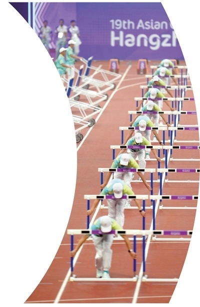 杭州奧體中心體育場(chǎng)內(nèi),志愿者在田徑項(xiàng)目女子七項(xiàng)全能100米欄比賽前準(zhǔn)備場(chǎng)地。 新華社記者 江文耀攝