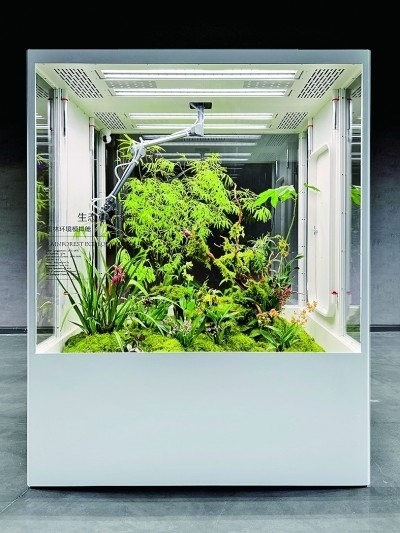 展廳一側(cè),三個立方體環(huán)境模擬艙并排放置,分別在近7立方米的空間內(nèi)模擬了雨林、海島、沙漠三種生態(tài)環(huán)境,引來許多觀眾圍觀?!霸诟邩橇至⒌亩际校芏嗳硕枷蛲鶕碛幸环綄儆谧约旱淖匀惶斓?。為人們在室內(nèi)打造一片‘原始森林’便成了我們的使命?!逼放苿?chuàng)始人李軍介紹,設(shè)計過程中,團隊遇到的一大的難點就是在保證室內(nèi)環(huán)境舒適度的同時,讓各類植物健康生長?!巴ㄟ^設(shè)計師的努力,我們首次將人造太陽光源、溫濕度控制、空氣流通、智能微噴等系統(tǒng)整合于室內(nèi)種植模擬環(huán)境中,實現(xiàn)了室內(nèi)種植智能化、自動化、現(xiàn)代化。”李軍表示,做設(shè)計亦要遵循自然法則,“人與自然和諧共生”是團隊始終不變的設(shè)計宗旨。