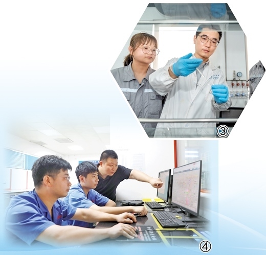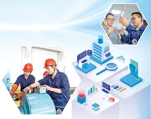 圖①:東港熱電公司博士創(chuàng)新站博士(左)與企業(yè)員工討論實驗反應結(jié)果。圖②:東港熱電公司員工(右)帶領(lǐng)參與博士創(chuàng)新站實踐工作的大學生檢修設備。