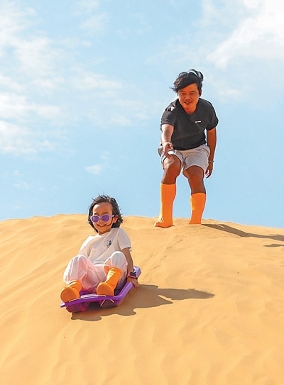 休閑運(yùn)動(dòng)小朋友在寧夏回族自治區(qū)中衛(wèi)市沙坡頭景區(qū)滑沙。 新華社記者 呂 帥攝
