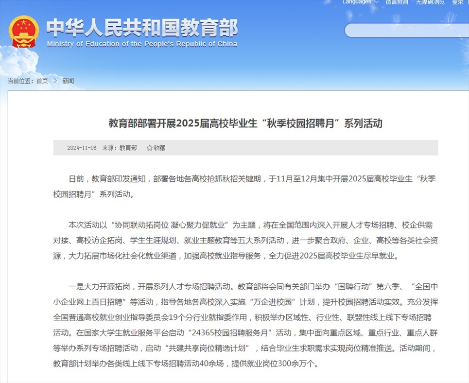記者11月6日從教育部獲悉,教育部近日印發(fā)通知,部署各地各高校搶抓秋招關(guān)鍵期,于11月至12月集中開展2025屆高校畢業(yè)生“秋季校園招聘月”系列活動。