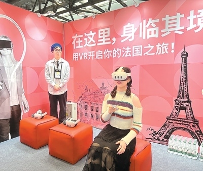 法國高校展區(qū)設(shè)立了VR體驗(yàn)項(xiàng)目,觀眾戴上眼鏡后可以看到埃菲爾鐵塔等地標(biāo)建筑。