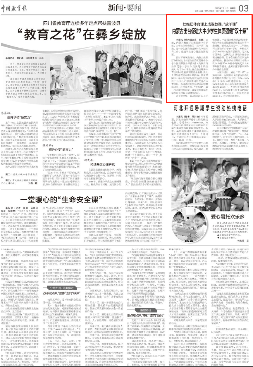 2025年7月11日,《中國教育報》第3版刊發(fā)題為《杜絕把體育課上成說教課、“放羊課”內(nèi)蒙古出臺促進(jìn)大中小學(xué)生體質(zhì)強健“雙十條”》的文章,報道了內(nèi)蒙古教育廳印發(fā)促進(jìn)中小學(xué)生、大學(xué)生體質(zhì)強健的“雙十條”措施,進(jìn)一步加強和改進(jìn)新時代學(xué)校體育工作,促進(jìn)學(xué)生身心健康全面發(fā)展。