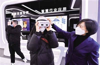 1月19日,參觀者在內(nèi)蒙古5G產(chǎn)業(yè)創(chuàng)新基地體驗(yàn)5GVR頭盔。當(dāng)日,由內(nèi)蒙古和林格爾新區(qū)攜手電信、移動(dòng)、聯(lián)通、鐵塔、華為建設(shè)的全區(qū)首個(gè)“內(nèi)蒙古5G產(chǎn)業(yè)創(chuàng)新基地”在和林格爾新區(qū)正式揭牌。該基地的投用標(biāo)志著和林格爾新區(qū)在打造數(shù)字產(chǎn)業(yè)平臺(tái)、集聚5G產(chǎn)業(yè)生態(tài)、推廣5G應(yīng)用創(chuàng)新方面又取得了新突破。(記者 王磊 攝)