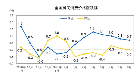 國家統(tǒng)計局14日發(fā)布數(shù)據(jù),9月份,全國居民消費價格指數(shù)(CPI)同比上漲0.7%,漲幅比上月回落0.1個百分點;工業(yè)生產(chǎn)者出廠價格指數(shù)(PPI)同比上漲10.7%,漲幅比上月擴大1.2個百分點。
