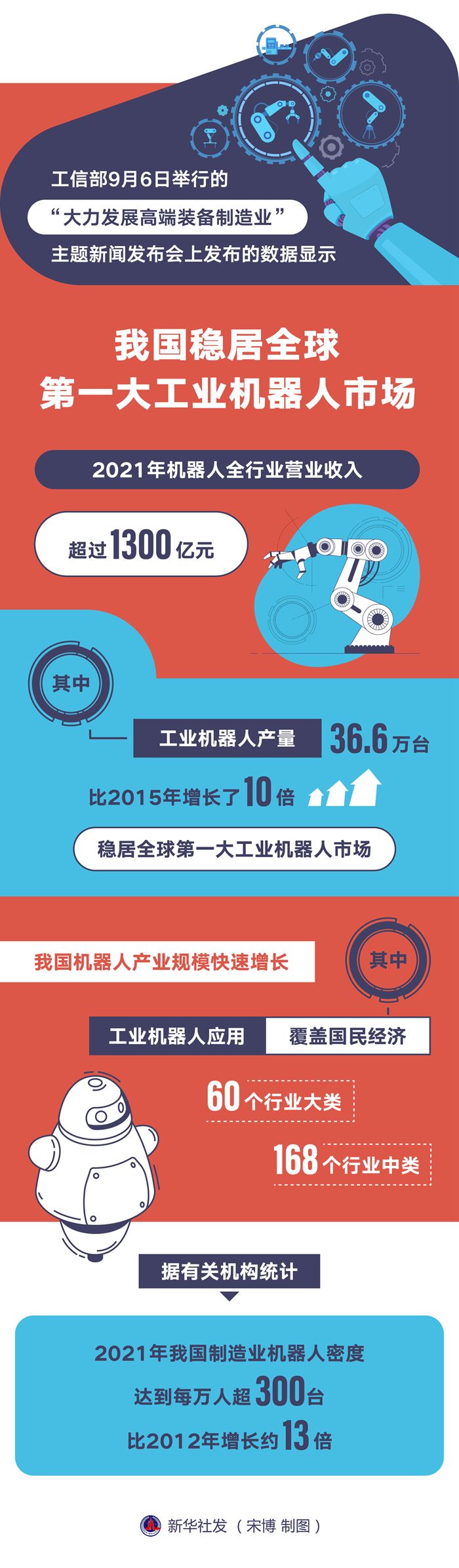 工信部裝備工業(yè)一司副司長郭守剛6日表示,我國機(jī)器人產(chǎn)業(yè)規(guī)??焖僭鲩L,2021年機(jī)器人全行業(yè)營業(yè)收入超過1300億元。其中,工業(yè)機(jī)器人產(chǎn)量達(dá)36.6萬臺,比2015年增長了10倍,穩(wěn)居全球第一大工業(yè)機(jī)器人市場。