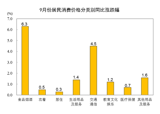 9月份,食品煙酒類價(jià)格同比上漲6.3%,影響CPI(居民消費(fèi)價(jià)格指數(shù))上漲約1.73個(gè)百分點(diǎn)。食品中,鮮果價(jià)格上漲17.8%,影響CPI上漲約0.31個(gè)百分點(diǎn);畜肉類價(jià)格上漲16.0%,影響CPI上漲約0.50個(gè)百分點(diǎn),其中豬肉價(jià)格上漲36.0%,影響CPI上漲約0.45個(gè)百分點(diǎn);鮮菜價(jià)格上漲12.1%,影響CPI上漲約0.25個(gè)百分點(diǎn);蛋類價(jià)格上漲7.3%,影響CPI上漲約0.05個(gè)百分點(diǎn);糧食價(jià)格上漲3.6%,影響CPI上漲約0.06個(gè)百分點(diǎn);水產(chǎn)品價(jià)格上漲2.8%,影響CPI上漲約0.06個(gè)百分點(diǎn)。