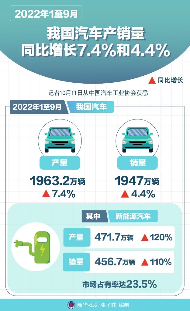 記者11日從中國汽車工業(yè)協(xié)會(huì)獲悉,今年1至9月,我國汽車產(chǎn)銷量分別達(dá)1963.2萬輛和1947萬輛,同比增長7.4%和4.4%。其中,新能源汽車產(chǎn)銷量分別達(dá)471.7萬輛和456.7萬輛,同比增長120%和110%,市場占有率達(dá)23.5%。