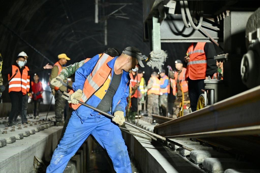建設(shè)者們?cè)谕瓿扇€鋼軌的最后鋪架。(中國鐵路成都局集團(tuán)公司供圖)