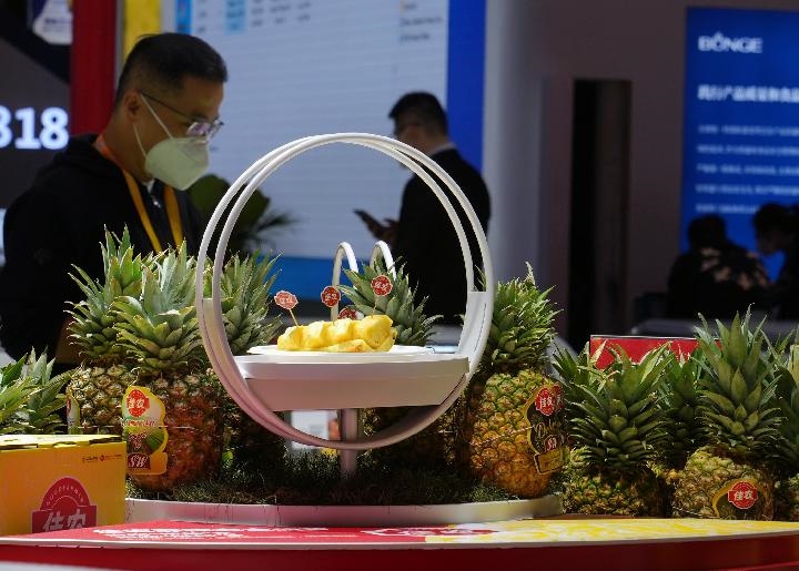 11月5日在第五屆進(jìn)博會食品及農(nóng)產(chǎn)品展區(qū)拍攝的菲律賓黑鉆鳳梨。新華社記者 劉穎 攝