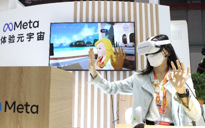 11月7日,在第五屆進(jìn)博會技術(shù)裝備展區(qū)的人工智能專區(qū),一名媒體工作人員借助VR頭戴設(shè)備體驗(yàn)虛擬工作空間“元宇宙”交互應(yīng)用。新華社記者 侯俊 攝