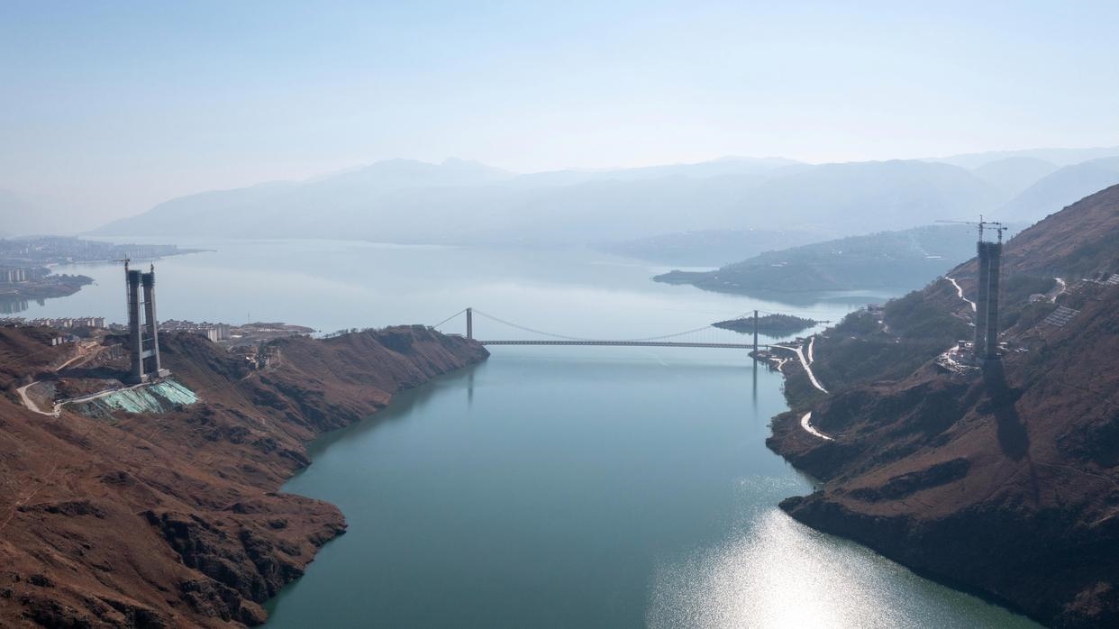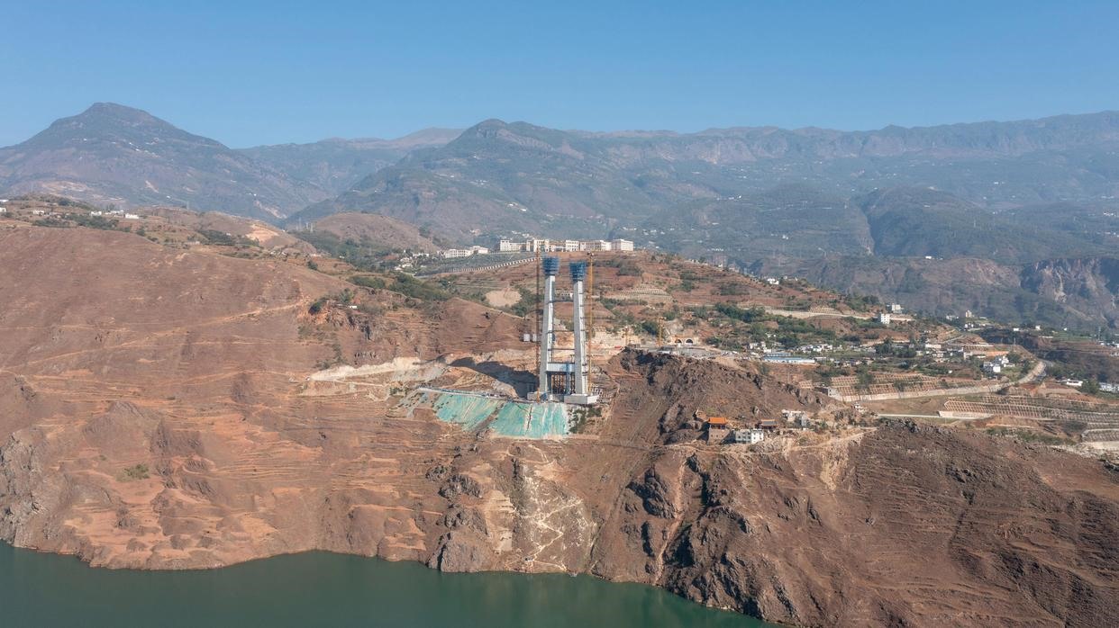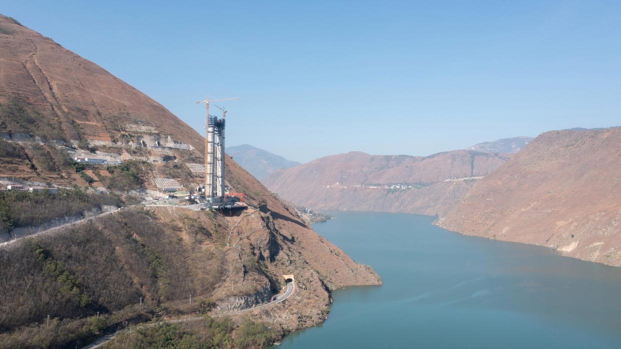 這是11月24日拍攝的川滇金沙江特大橋云南岸施工現(xiàn)場(chǎng)(無(wú)人機(jī)照片)。新華社記者 胥冰潔 攝