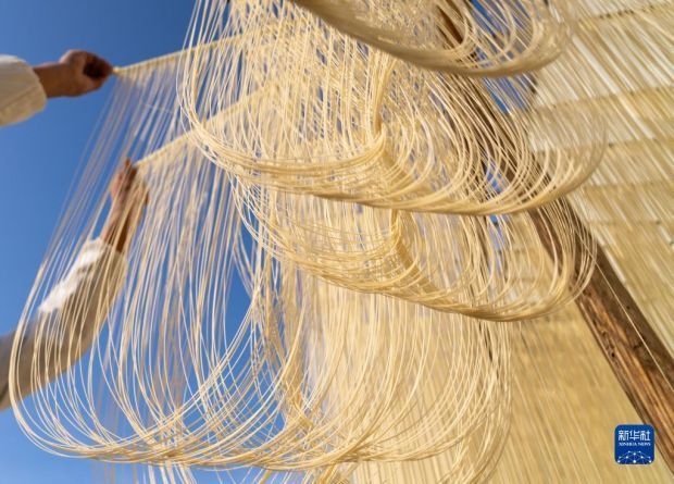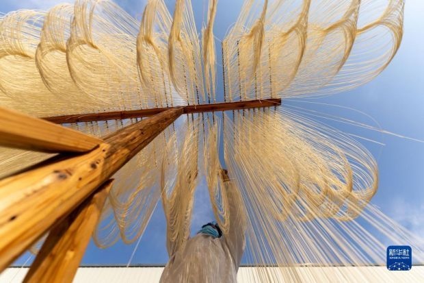 12月12日,在竹塘社區(qū)掛面合作社的掛面車(chē)間,工人將掛面上架晾曬。新華社發(fā)(阮雪楓 攝)