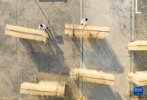 12月12日,在竹塘社區(qū)掛面合作社的掛面車(chē)間,工人在將掛面上架晾曬(無(wú)人機(jī)照片)。新華社發(fā)(阮雪楓 攝)