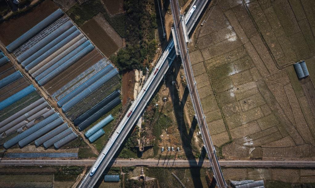 12月16日,列車(chē)行駛在與玉河鐵路(上)、滇越鐵路(底層)相互交叉的彌蒙高鐵線(中)(無(wú)人機(jī)照片)。新華社記者 王冠森 攝