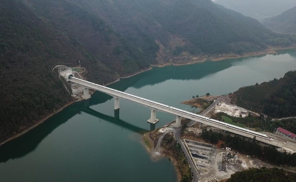 圖為“復(fù)興號(hào)”列車行駛經(jīng)過杭黃高鐵位于浙江淳安的進(jìn)賢溪大橋(無人機(jī)拍攝)。新華社記者 黃宗治 攝