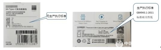 5.46款樣品有36款明示了生產(chǎn)執(zhí)行標準,10款未明示生產(chǎn)執(zhí)行標準。明示的標準絕大多數(shù)為企業(yè)標準,少數(shù)為已過時效期的行業(yè)標準,或與數(shù)據(jù)線產(chǎn)品無相關(guān)性的安全標準。