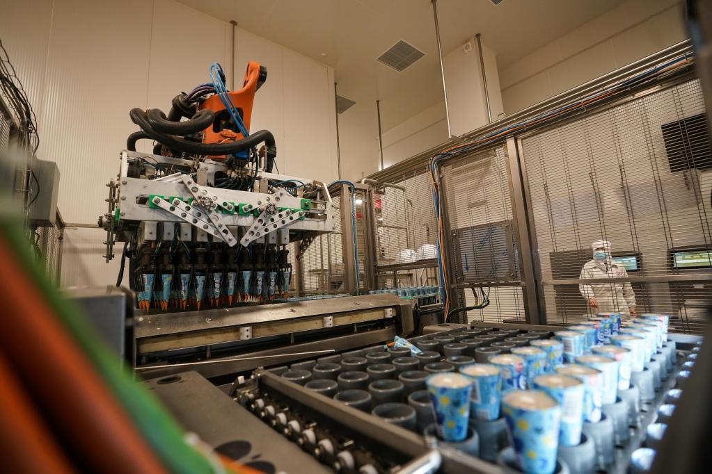 位于江蘇蘇州太倉的聯(lián)合利華和路雪生產(chǎn)基地,于2021年9月獲評全球“燈塔工廠”,成為當(dāng)?shù)亍爸悄苤圃臁钡臉?biāo)桿。工廠里,機器人正將產(chǎn)品轉(zhuǎn)移到速凍隧道。新華社記者 季春鵬 攝