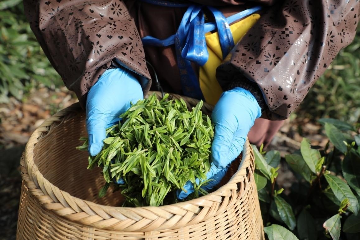 采茶工在杭州市西湖風(fēng)景名勝區(qū)西湖街道龍井村的茶山上采摘西湖龍井明前茶。人民網(wǎng) 方彭依夢(mèng)攝