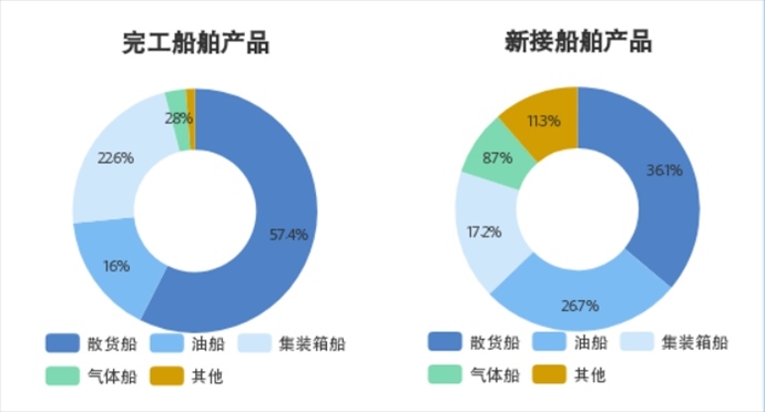 具體來看,在1—3月新接船舶產(chǎn)品訂單結構中,占比最高的散貨船為36.1%,油船占比26.7%,集裝箱船占比17.2%,氣體船占比8.7%。在完工船舶產(chǎn)品結構中,散貨船占比57.4%,集裝箱船占比22.6%,油船占比16%,氣體船占比2.8%。
