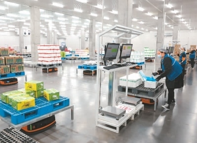 2月27日,在湖北省襄陽市好鄰居生鮮物流中心,機器人根據工作人員指令穿梭于貨架之間,自動分揀蔬菜、水果等生鮮產品。楊 東攝(人民視覺)