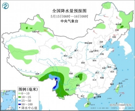 5月15日08時至16日08時,云南中西部、西藏東南部、川西高原南部、重慶南部、貴州北部等地的部分地區(qū)有中到大雨,其中,西藏東南部、云南西部等地部分地區(qū)有暴雨(50~60毫米)。內(nèi)蒙古、東北地區(qū)、新疆北部等地的部分地區(qū)有4~6級風(fēng),其中,新疆東部部分地區(qū)有6~7級風(fēng),東部山口局地陣風(fēng)風(fēng)力可達10級左右。