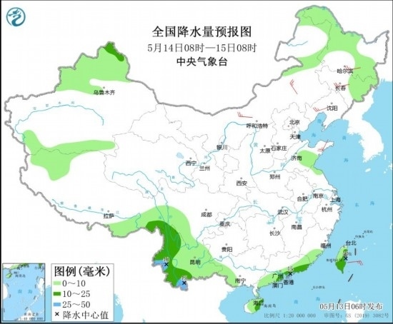 全國降水量預(yù)報圖(5月13日08時-14日08時)