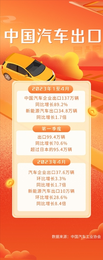 中國汽車工業(yè)協(xié)會的統(tǒng)計(jì)數(shù)據(jù)顯示,今年第一季度,國內(nèi)汽車企業(yè)出口99.4萬輛,同比增長70.6%,超過日本的95.4萬輛。最新數(shù)據(jù)顯示,4月份,出口37.6萬輛,同比增長1.7倍,其中,電動、混動等新能源汽車出口10萬輛,環(huán)比增長28.6%,同比增長8.4倍,保持良好勢頭。