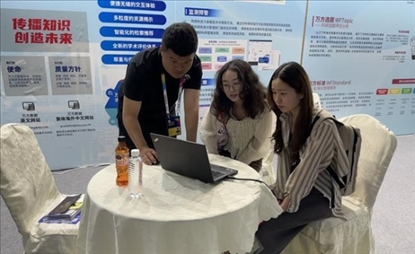 萬(wàn)方數(shù)據(jù)工作人員現(xiàn)場(chǎng)為用戶進(jìn)行產(chǎn)品演示。(受訪者供圖)